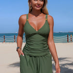 Culori curate și solide, un decolteu în V plisat, bretele aurii și pantaloni scurți asortați cu buzunare reale: Harper este tankini-ul pentru femeia care vrea să arate îngrijită pe plajă fără să se gândească prea mult. Fără imprimeuri, fără complicații. Pur și simplu o siluetă frumos simplă care flatează, acoperă și oferă ceea ce contează.
