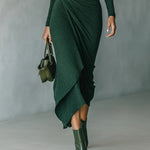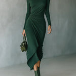 Felicia | Rochie midi asimetrică înfășurată cu pliseuri și guler înalt verde închis