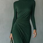 O rochie midi elegantă din tricot, înfășurată, cu guler înalt și drapaje scenografice pentru un look de seară chic. Asorteaz-o cu botine pentru un aer îndrăzneț. Adaugă o geantă pentru un strop de rafinament. Perfectă pentru petreceri de seară, cocktailuri sau weekenduri formale.