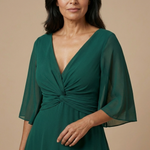 Detaliul încreșat de la talie stilizează figura în mod subtil, în timp ce mânecile largi adaugă o notă rafinată și elegantă. Perfectă pentru nunți, aniversări sau evenimente speciale unde vrei să te simți comodă fără să renunți la stil.