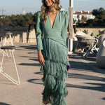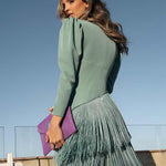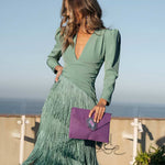 Rochia cu Franjuri Salvie — rochia lungă de damă virală din magazinul nostru online. Perfectă atât pentru evenimente de zi cât și pentru seri elegante.