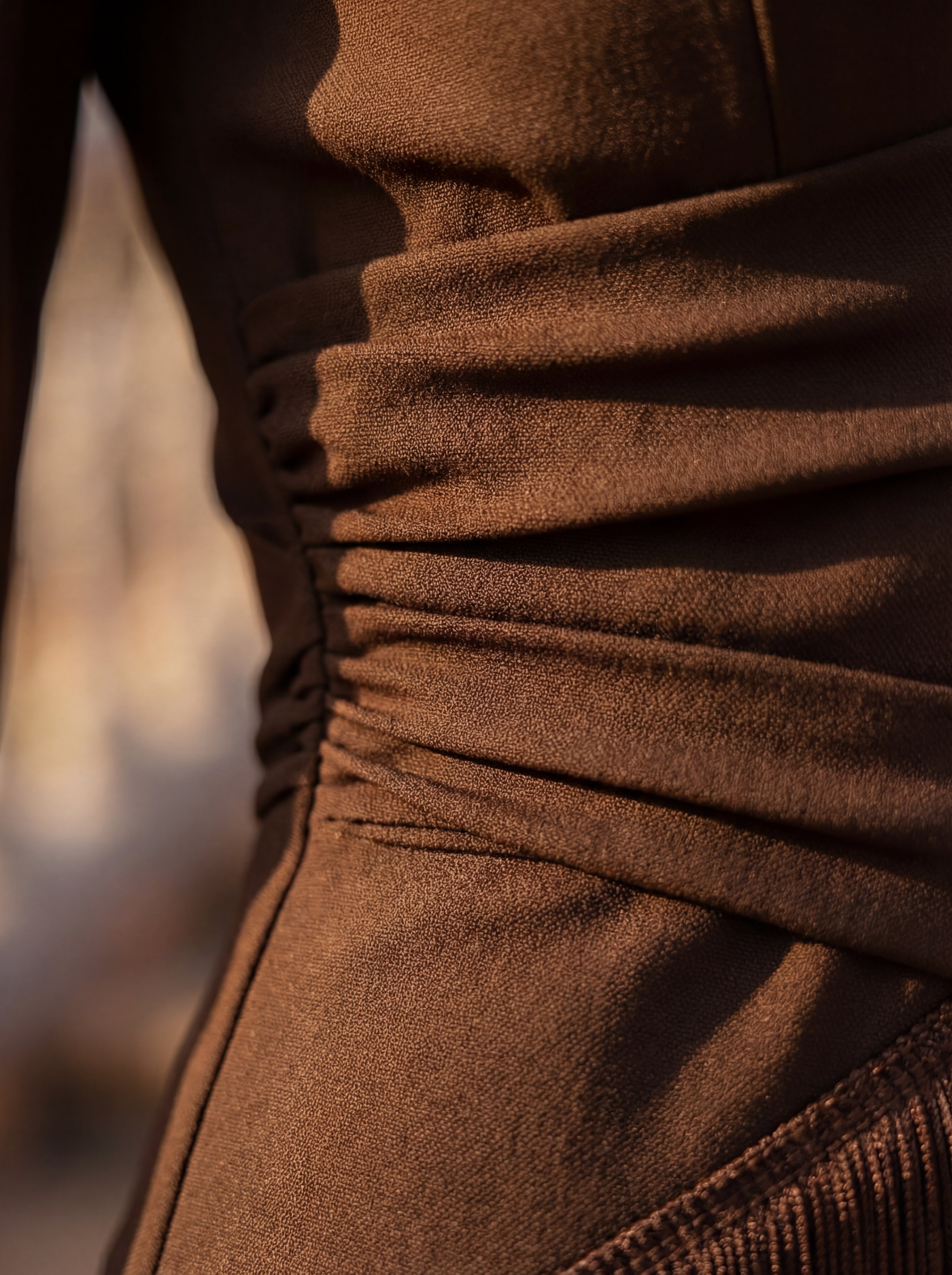 Partea inferioară a acestei rochii de eveniment este acoperită de o cascadă de franjuri în straturi diagonale. Drapajul de la talie pune în valoare silueta alături de decolteu-l profund în V. Deschidere în spate pentru o mișcare mai bună. Țesătură politehno combinată cu franjuri.