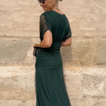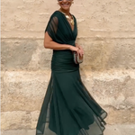 Această rochie lungă pune în valoare silueta în mod natural și îți afirmă prezența. Decolteu-l elegant în V și talia delicată încreșată stilizează fără să strângă.