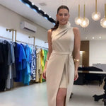 Descoperă eleganța atemporală cu rochia noastră asimetrică SOFIA, perfectă pentru evenimente speciale, ceremonii sau seri cu clasă. Confecționată dintr-o țesătură moale și structurată, prezintă un design cu un singur umăr cu drapaj la gât și o curea asortată care pune în valoare talia. Crestătura frontală adaugă o notă de senzualitate și rafinament, în timp ce închiderea laterală garantează un ajust impecabil.