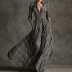 Un exemplu de rafinament atemporal, această rochie lungă curge cu o grație și precizie excepționale. Corsetul său structurat pune în evidență silueta, în timp ce fusta sa largă se desfășoară cu o siguranță serenă. Modelul subtil cu carouri evocă un farmec sofisticat impregnat de un atractiv clasic. Concepută pentru a evidenția frumusețea naturală, întruchipează arta de a te îmbrăca cu încredere și profunzime.
