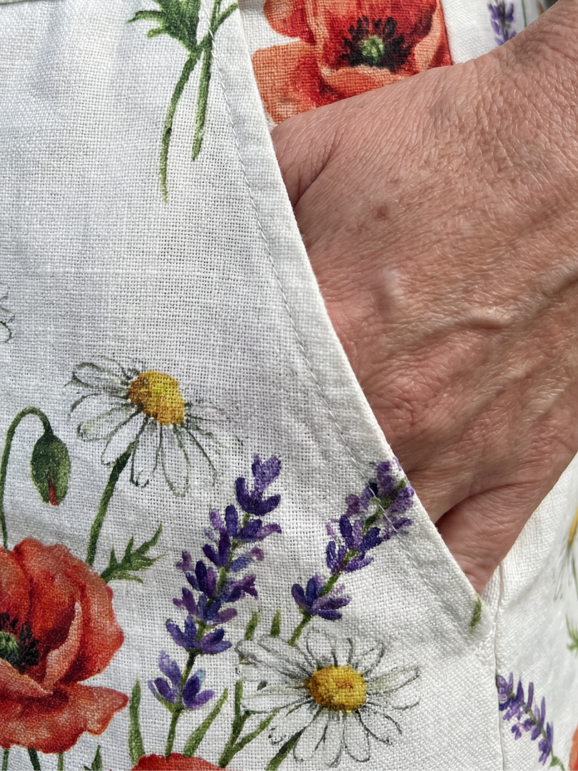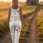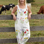 Această piesă este o salopetă fără mâneci, cu o formă relaxată și un design cu picioare conice, având un model floral. Materialul este ușor și permite libertate de mișcare pe parcursul întregii zile. Este potrivită pentru ținute casuale sau timp petrecut în aer liber.