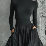 • Detalii: guler înalt, mâneci lungi și fustă lungă plisată <