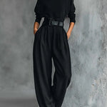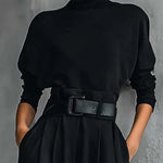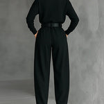 Acest set din 2 piese stilat combină simplitatea și eleganța într-un look negru rafinat, care se potrivește fără efort oricărei ocazii. Bluza cu guler înalt și mâneci lungi formează împreună cu pantalonii drepți un ansamblu modern, care conferă imediat o aură îngrijită și puternică.