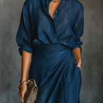 Această rochie maxi elegantă radiază calm și clasă datorită lungimii fluide și culorii albastru închis intens. Decolteu în V și mânecile lungi conferă designului o aură rafinată, care se potrivește fără efort atât ocaziilor de zi cu zi, cât și evenimentelor speciale.