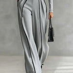 • Combinație flatantă dintre bluză mulată și pantaloni largi Contrastul dintre cele două piese creează o siluetă feminină.