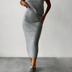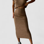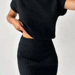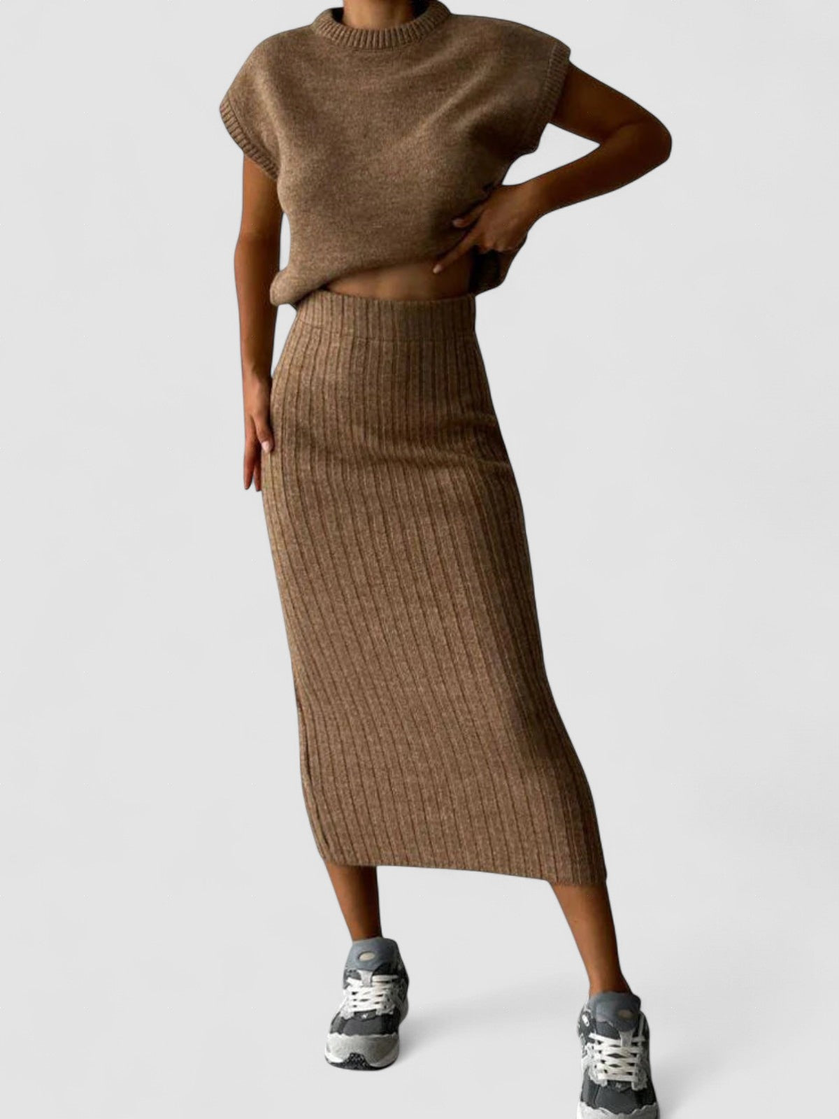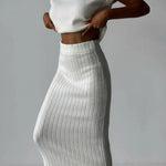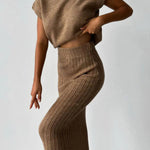 Design: Acest set include un top tricotat gros asociat cu o fustă midi tricotată cu talie înaltă, oferind un ansamblu confortabil și elegant.