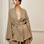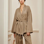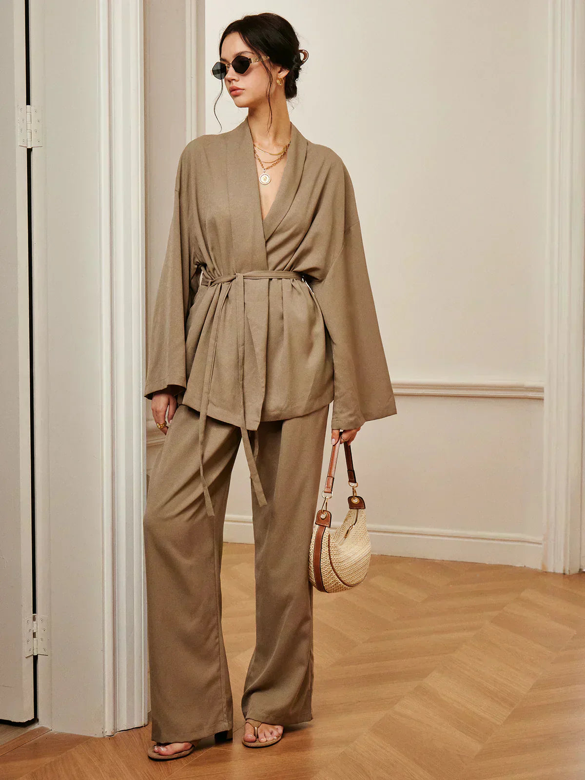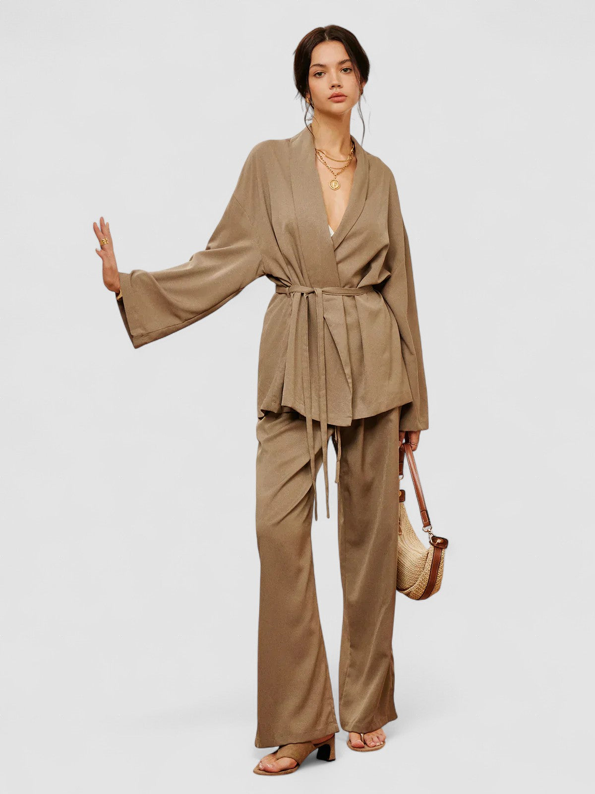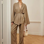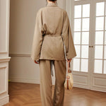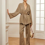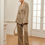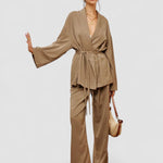 Design: Un set sofisticat din două piese, cu un top în stil împăturit și talie cu curea, asociat cu pantaloni eleganți cu talie înaltă. Designul minimalist, dar structurat, oferă un aspect rafinat și fără efort.