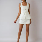 Design: Acest set prezintă un top sofisticat fără mâneci cu un guler pătrat, asociat cu o fustă asortată, creând un ansamblu coerent și stilat.