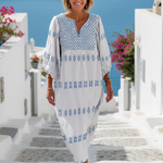 Îmbracă-te cu eleganță și confort în această rochie maxi, perfectă pentru zilele călduroase și ieșirile relaxante. Rochia are un decolteu în V delicat și mâneci lungi lejere, oferindu-ți o siluetă fluidă și feminină.