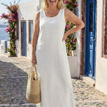 Descoperă rochia perfectă pentru zilele călduroase! Această rochie are o silhouette simplă și dreaptă, cu un decolteu rotund și o formă fluidă care îți va oferi confort pe parcursul întregii zile.