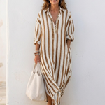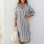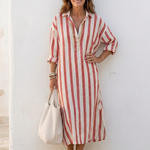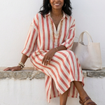 Descoperă rochia midi din bumbac, care îmbină stilul cu confortul! Această rochie are o silhouette lejeră, evidențiată de dungi verticale, și un guler cu închidere cu nasturi, ideal pentru un look casual și elegant.