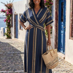 Saphira | Rochie midi cu decolteu în V, mâneci scurte și dungi