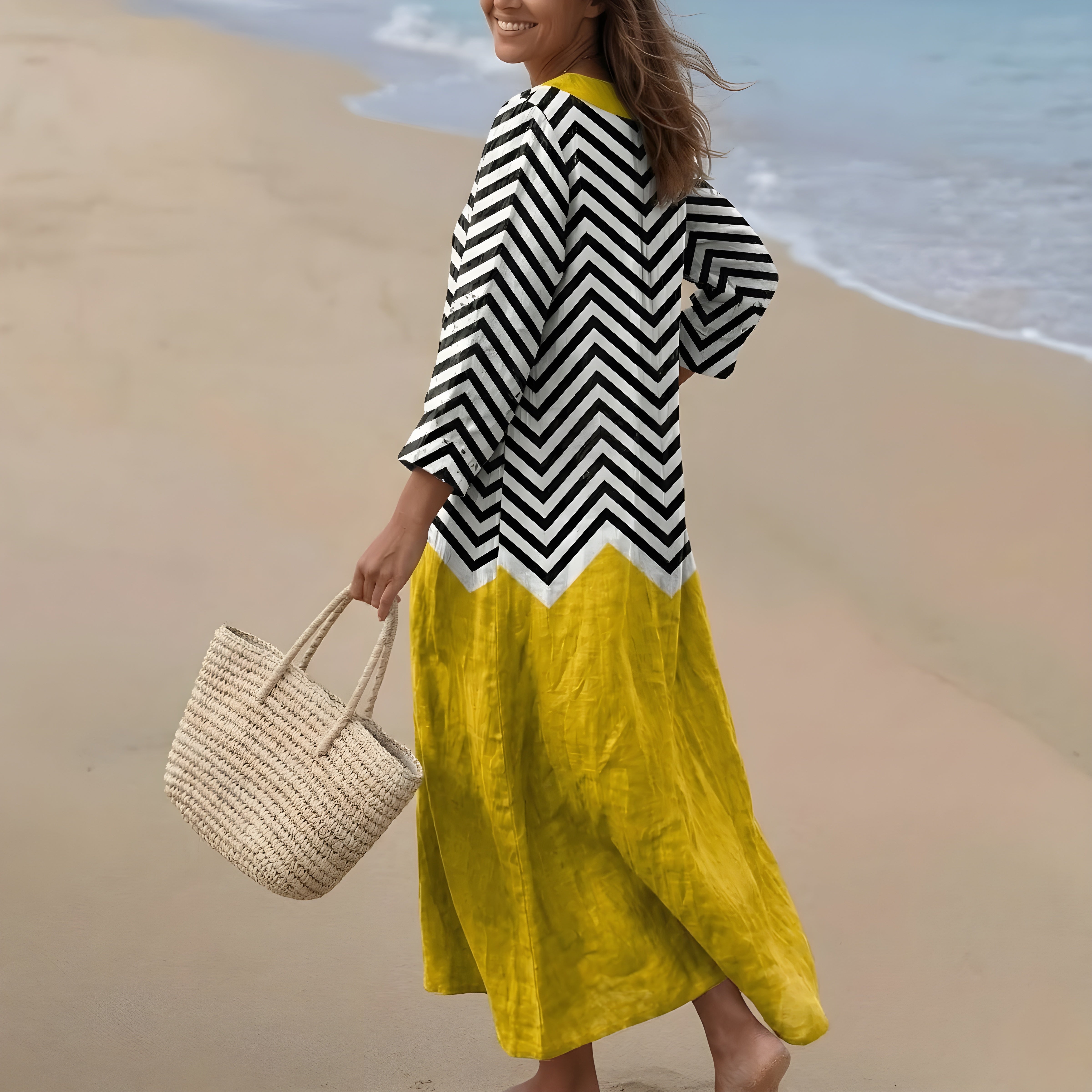 L'Abito Melodi Tessa cattura un senso di stile vibrante con la sua straordinaria combinazione di strisce zigzag nere e bianche e toni gialli audaci. La parte superiore geometrica aggiunge interesse visivo, mentre il tessuto morbido e fluido della gonna crea una silhouette rilassata e lusinghiera. Il scollo a V esalta il design femminile, rendendo questo abito perfetto per giornate di sole o uscite informali.